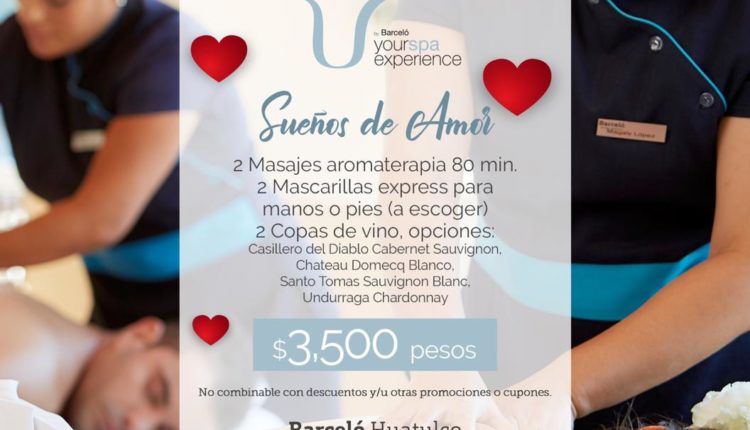 Noticias de Huatulco Hotel Barcelo yourspa experience!! Sueños de Amor By Yvan Luna On Feb 14, 2020 252 Share 2 masajes aromaterapia 80 minutos, 2 mascarillas express para manos y pies ,🥂 2 copas de vino $3500 no combinable con descuentos y otras promociones o cupones Noticias en Huatulco 252 Share FacebookWhatsAppTwitterGoogle+PinterestEmail