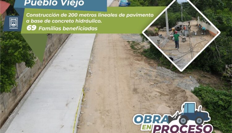 En Pueblo Viejo el equipo de Obras Públicas trabaja en la pavimentación a base de concreto hidráulico de 200 metros lineales, los cuales beneficiarán a 69 familias de esta comunidad.