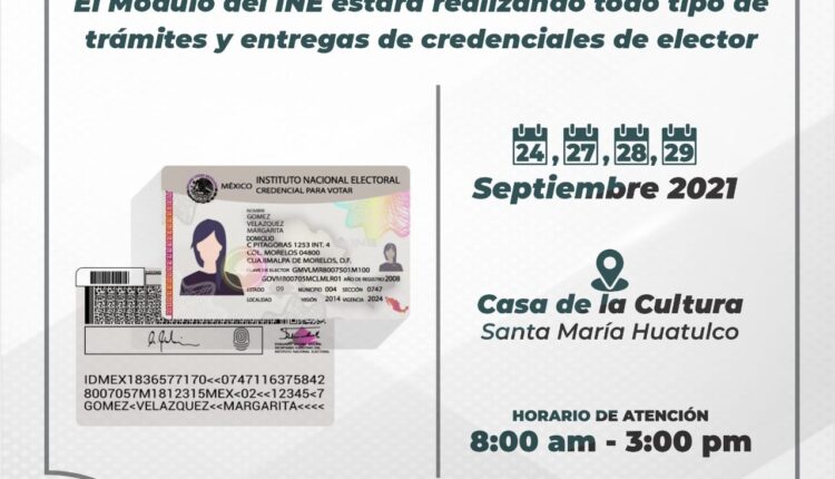 El gobierno municipal informa a la ciudadanía que el módulo del INE estará brindando atención los días 24, 27, 28 y 29 de septiembre en la Casa de la Cultura de Santa María Huatulco.