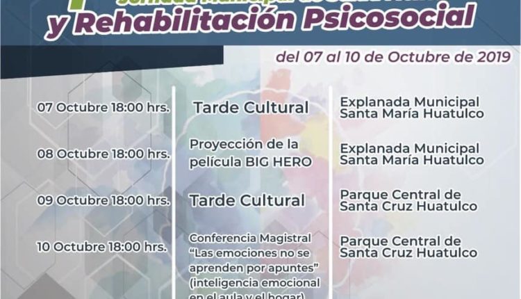 El Gobierno Municipal de Santa María Huatulco a través del área de Salud invita a la población en general a participar en la Primera Jornada Municipal de Salud Mental y Rehabilitación Psicosocial «La salud mental, una perspectiva interdisciplinaria».