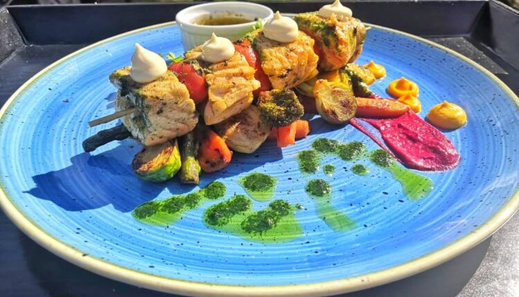 Brocheta de Salmón a las finas hierbas, vegetales baby salteados y menier de almendras