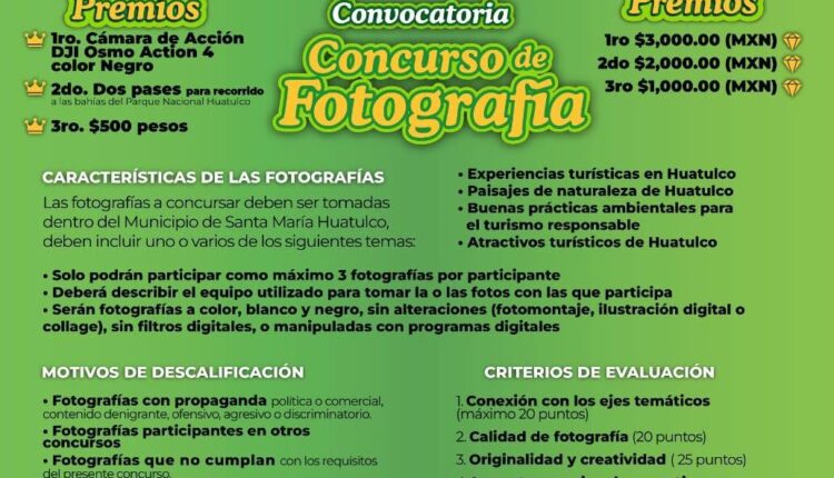 En el marco del 4to Festival del Turismo, edición 2025, el Gobierno Municipal de Santa María Huatulco, invita a la ciudadanía a participar en el concurso de fotografía.
