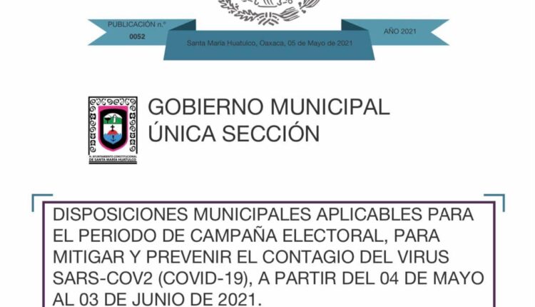 Gaceta Oficial del Gobierno Municipal de Santa María Huatulco sobre el periodo de campañas electorales 2021 y así mitigar y prevenir el contagio del virus SarsCov-2. Consulta las disposiciones en pdf en el siguiente link https://s3.us-west-2.amazonaws.com/…/gaceta…