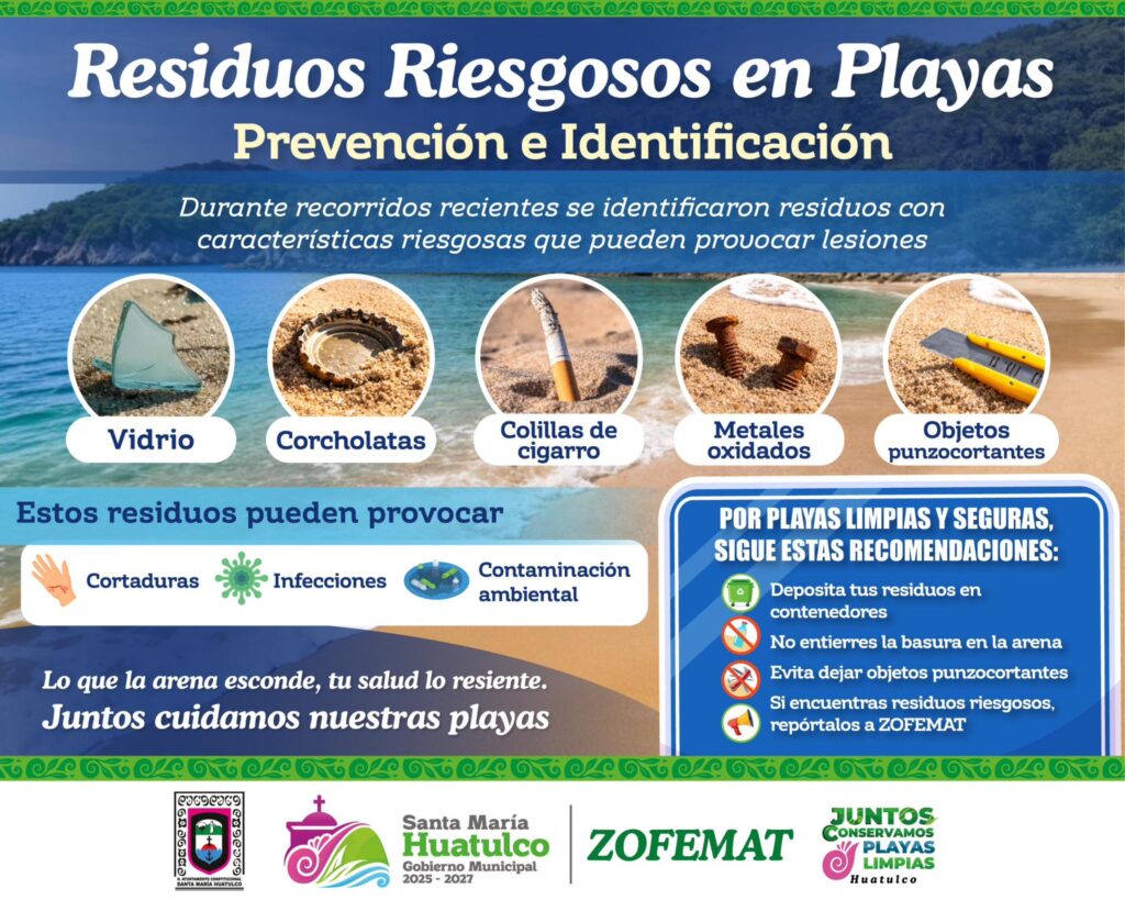 El Gobierno Municipal de Santa María Huatulco, que preside el Ing. Julio Cárdenas, a través de ZOFEMAT, exhorta a la población a depositar sus residuos en los contenedores, no enterrar la basura, evitar dejar objetos punzocortantes y reportar cualquier residuo riesgoso.