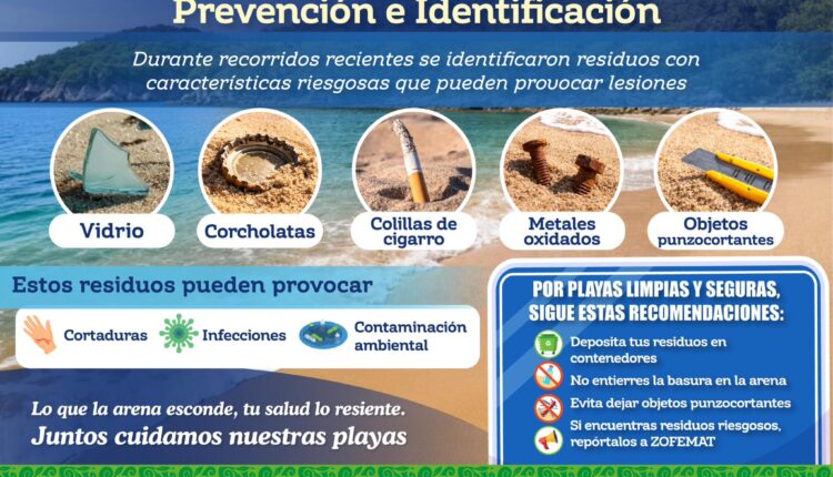 Como parte de las acciones preventivas para mantener nuestras playas limpias y seguras, se refuerza la identificación y manejo adecuado de residuos con características riesgosas como vidrio, corcholatas, colillas de cigarro, metales oxidados y objetos punzocortantes, ya que pueden provocar cortaduras, infecciones y contaminación ambiental si no se disponen correctamente.