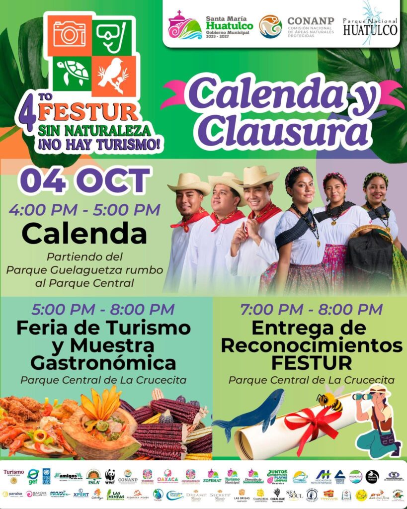 En el marco del FESTUR 2025, el Gobierno Municipal de Santa María Huatulco, a través de la Comisión Nacional de Áreas Naturales Protegidas (CONANP) y el Parque Nacional Huatulco, invita a la ciudadanía a participar en la calenda y clausura del 4º Festival del Turismo Huatulco 2025.