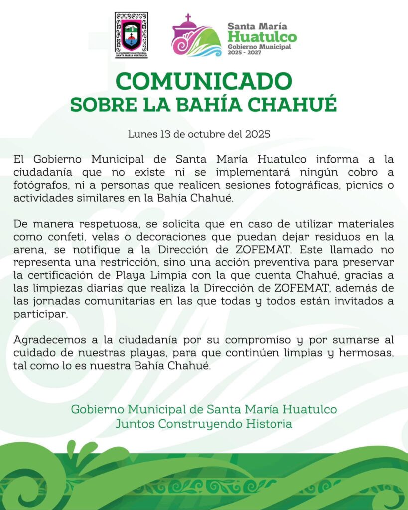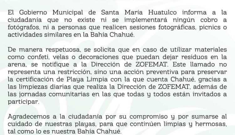 El Gobierno Municipal de Santa María Huatulco informa a la ciudadanía que no existe ni se implementará ningún tipo de cobro por el uso de la Bahía Chahué.