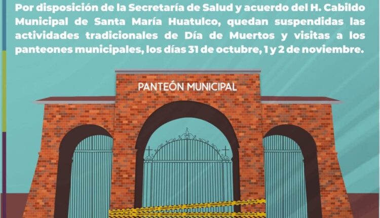 El gobierno municipal informa a la ciudadanía en general, que quedan suspendidas las visitas al panteón municipal de Santa María Huatulco y de las agencias de Santa Cruz Huatulco, Bajos de Coyula y Arroyo Xúchilt, con la finalidad de prevenir aglomeraciones y contagios de Covid-19.