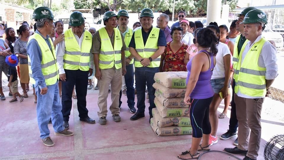 En una productiva y satisfactoria visita a la comunidad de San José Pueblo Viejo, el Presidente Municipal supervisa la construcción de un piso de concreto hidráulico y techado comunitario.