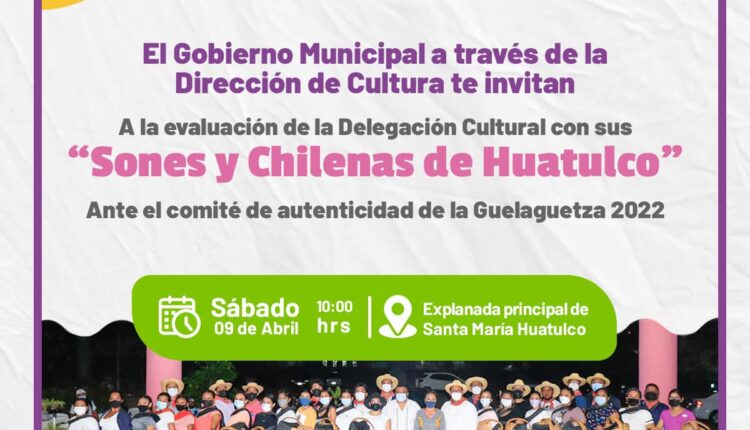 El Gobierno Municipal a través de la Dirección de Cultura, invita cordialmente a la población en general a presenciar la evaluación de la Delegación Cultural de Santa María Huatulco con sus “Sones y Chilenas” ante el comité de autenticidad, la cita es este sábado 09 de abril, a las 10 de la mañana, en la explanada principal de la cabecera municipal, ¡los esperamos!