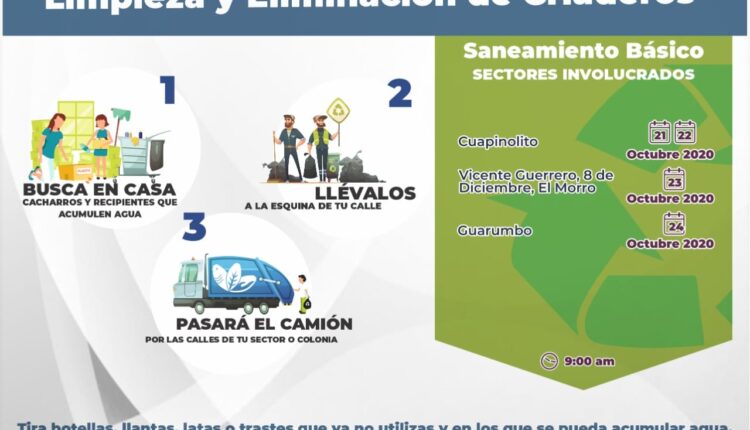 El gobierno municipal invita a la ciudadanía a participar en la campaña de descacharrización programa para los barrios Cuapinolito, Vicente Guerrero, 8 de Diciembre, El Morro y Guarumbo de la cabecera municipal.