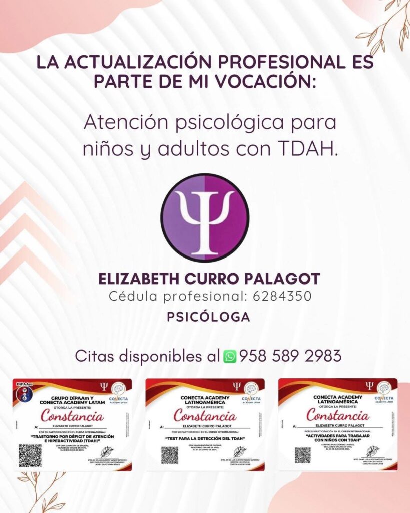 La psicóloga Elizabeth Curro Palagot ofrece atención profesional para niñas, niños y adultos, brindando acompañamiento en temas de salud mental, desarrollo emocional y trastornos de atención.