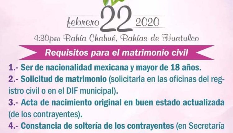 El Sistema DIF y el gobierno municipal de Santa María #Huatulco invitan a las parejas a formalizar su relación, este 22 de febrero, en las Bodas Colectivas 2020.