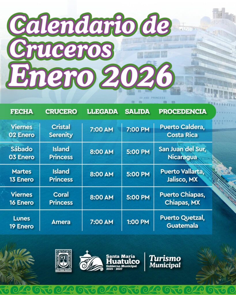 La temporada de cruceros 2025-2026 continúa con gran actividad en Huatulco. Durante el mes de enero de 2026, el muelle de Santa Cruz recibirá importantes embarcaciones, destacando el arribo de visitantes internacionales que fortalecen la economía local.