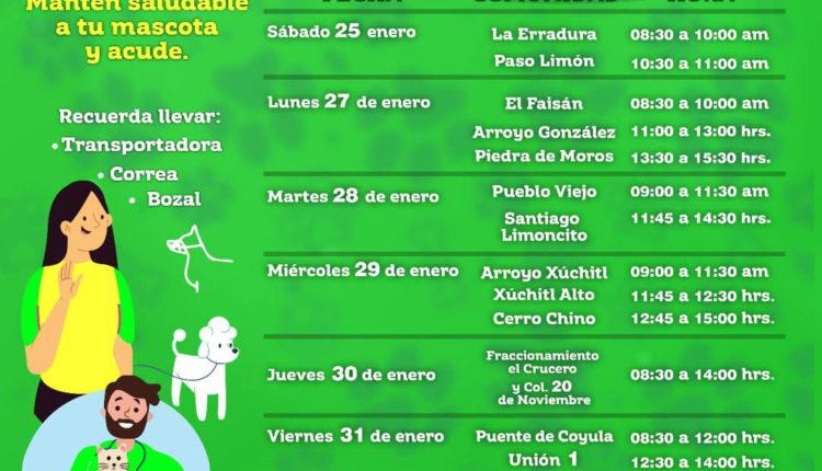 Las jornadas se realizarán en distintos puntos del municipio, como; La Erradura, El Faisán, Pueblo Viejo, y muchas comunidades más, en los horarios específicos que permitirán a las familias llevar a sus mascotas. Asimismo, se les recuerda a los asistentes llevar; transportadora, correa y bozal si es necesario.