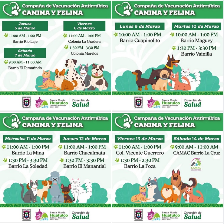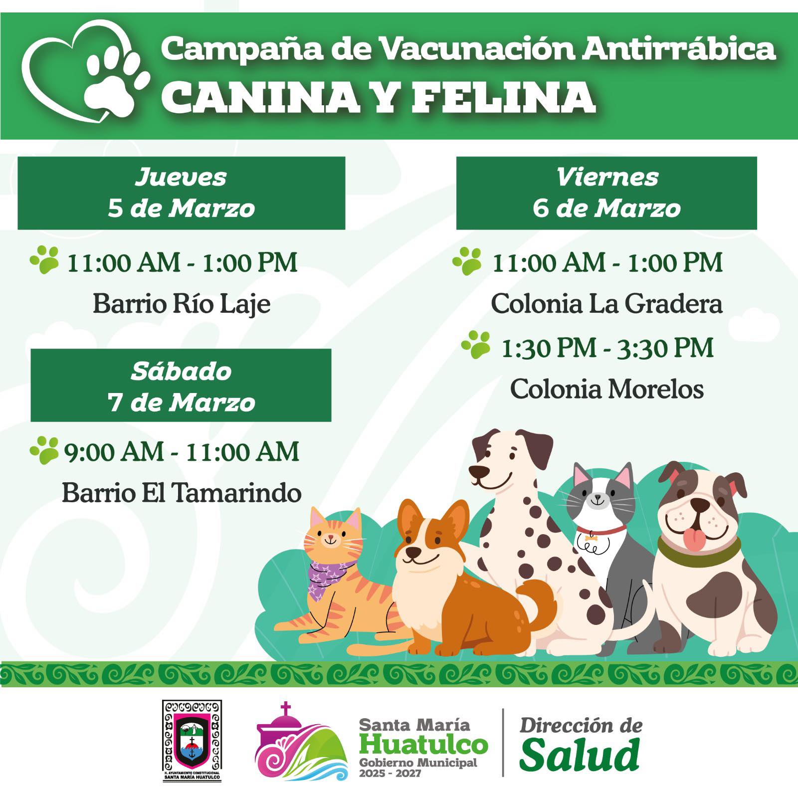 El Gobierno Municipal de Santa María Huatulco, que preside el Ing. Julio Cárdenas, a través de la Dirección de Salud, informa el inicio de la campaña de vacunación antirrábica canina y felina, que se llevará a cabo del 5 al 14 de marzo, con el objetivo de proteger la salud de perros y gatos, así como prevenir enfermedades que representen un riesgo para la población.