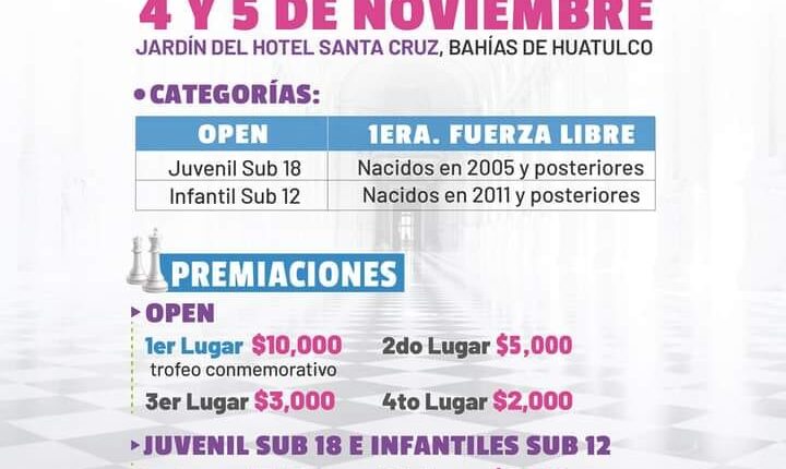 EventosMunicipio Campeonato Nacional Abierto de Ajedrez Huatulco 2023 By Yvan Luna On Oct 26, 2023 9 Share Inscríbete y sé parte de este Campeonato Nacional que reunirá a los mejores jugadores del país. ♟️Participa y juega tu mejor partida. Gobierno Municipal HuatulcoHuatulcoNoticias en Huatulco 9 Share FacebookWhatsAppTwitterGoogle+PinterestEmail