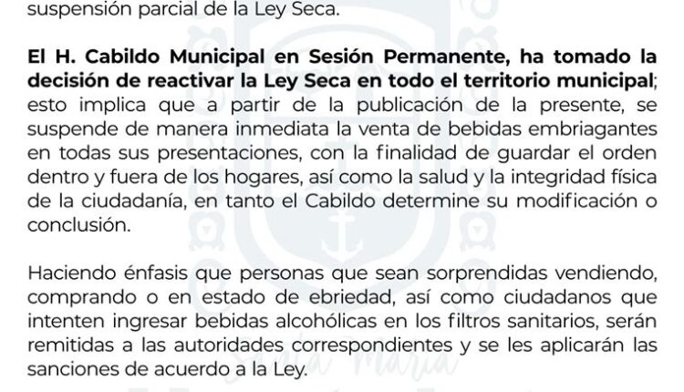 El H. Cabildo de Santa María Huatulco comunica la reactivación de la Ley Seca en todo el municipio.