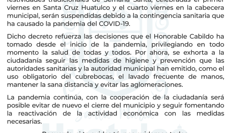 Comunicado Oficial del Gobierno Municipal de Santa María Huatulco informa que las festividades tradicionales de Semana Santa serán suspendidas debido a la contingencia sanitaria.