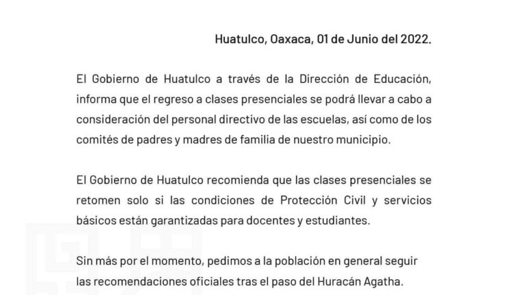 Te dejamos el siguiente comunicado emitido por el Gobierno de Huatulco para el regreso a clases tras consecuencias del huracán Agatha.