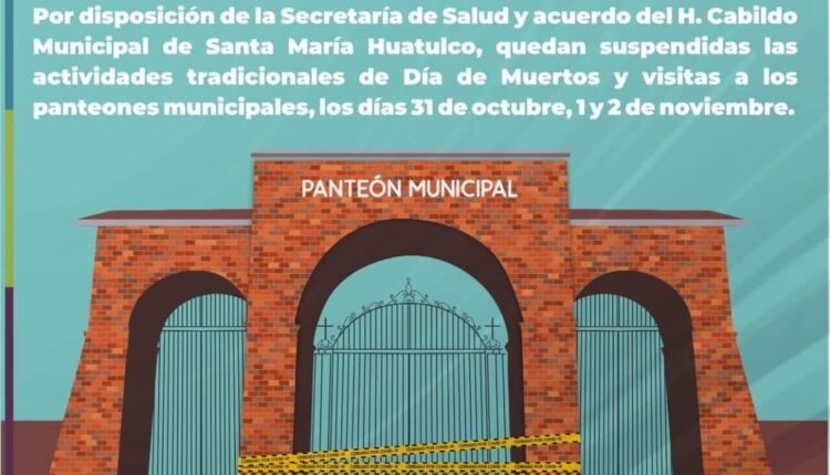 El gobierno de Huatulco recuerda a toda la ciudadanía que los panteones municipales estarán cerrados los días 31 de octubre, 1 y 2 de noviembre, con la finalidad de evitar la aglomeración de personas y poner en riesgo la salud pública ante la pandemia del Covid-19.