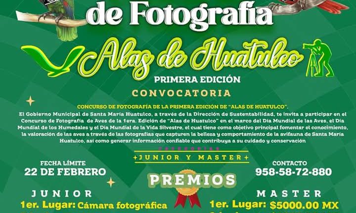 El Gobierno de Huatulco, a través de la Dirección de Sustentabilidad, te invita a participar en la 1ra Edición del Concurso de Fotografía de Aves. En el marco del Día Mundial de las Aves, el Día Mundial de los Humedales y el Día Mundial de la Vida Silvestre, buscamos resaltar la belleza y diversidad de la avifauna de nuestro municipio.