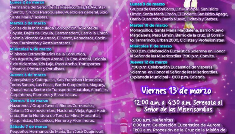 Durante estos días se llevarán a cabo celebraciones eucarísticas, serenata y mañanitas al Señor de las Misericordias, procesiones, así como la participación de barrios, comunidades, grupos parroquiales y distintos sectores de la población, fortaleciendo la unión y el espíritu comunitario.
