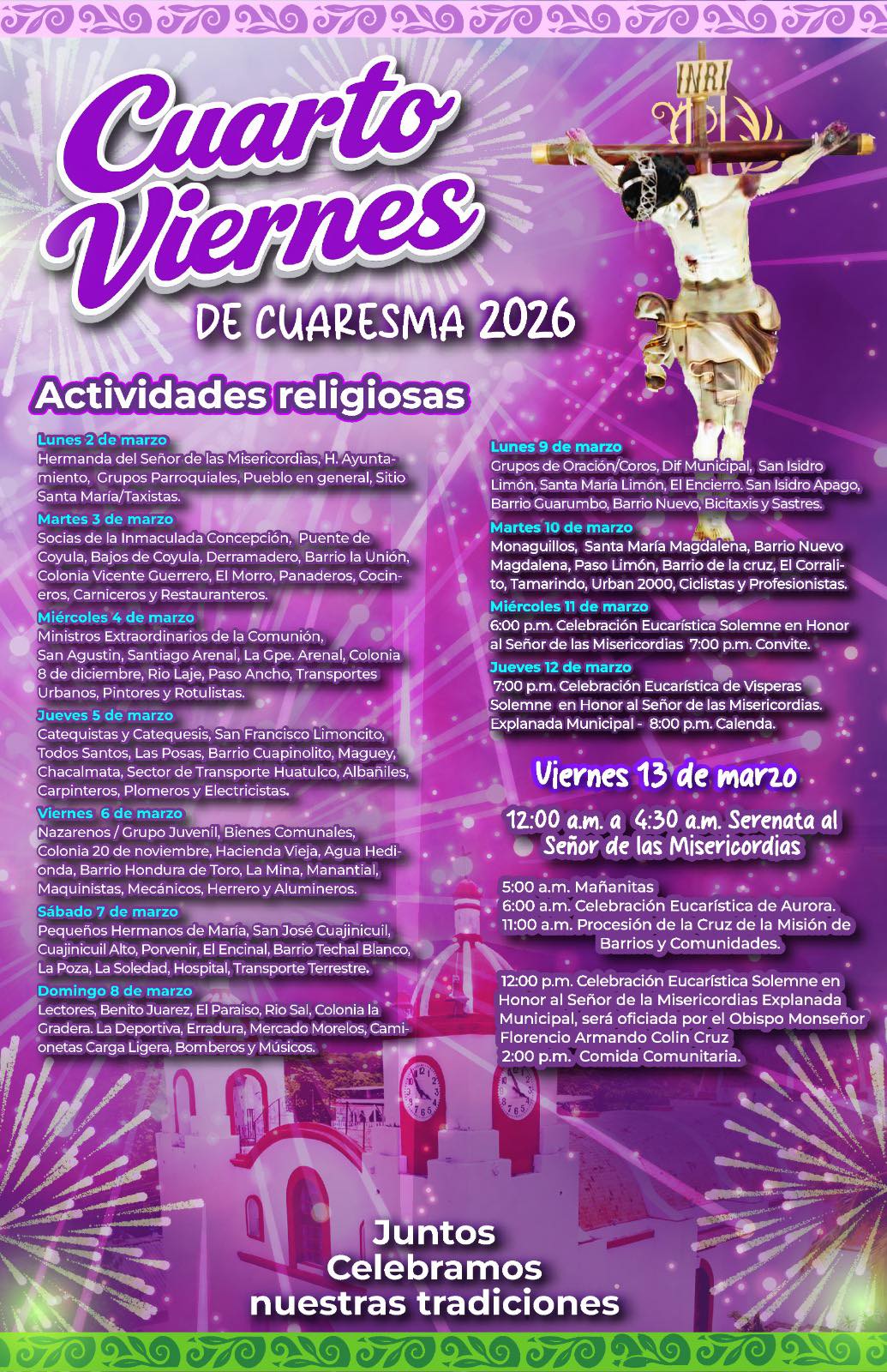 El Gobierno Municipal de Santa María Huatulco, que preside el Ing. Julio Cárdenas, a través de la Dirección de Diversidad Religiosa, invita a la ciudadanía y visitantes a participar en el programa de actividades religiosas del Cuarto Viernes de Cuaresma 2026, una de las celebraciones más representativas del municipio.