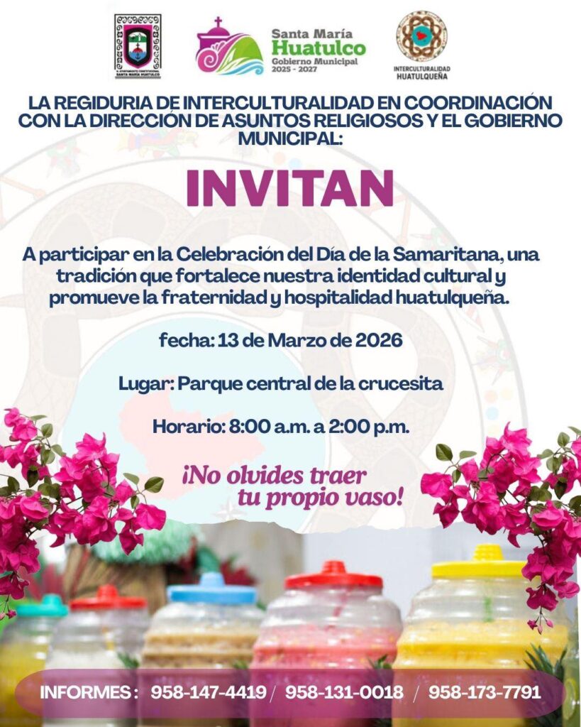 El Gobierno Municipal de Santa María Huatulco, que preside el Ing. Julio Cárdenas, a través de la Regiduría de Interculturalidad en coordinación con la Dirección de Asuntos Religiosos, invita a la ciudadanía y visitantes en Bahías de Huatulco a participar en la celebración del Día de la Samaritana, una tradición que fortalece la identidad cultural y promueve la fraternidad y hospitalidad huatulqueña.