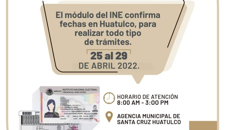 Se le informa a la población en general que el módulo del INE estará brindando atención del 25 al 29 de abril en la Agencia de Santa Cruz Huatulco, con un horario de 8:00 a 15:00 hrs.
