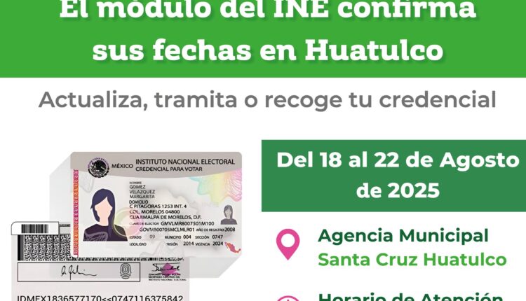 El Módulo del INE da a conocer los días en que se encontrará en Huatulco. Aprovecha para actualizar, tramitar o recoger tu credencial para votar.