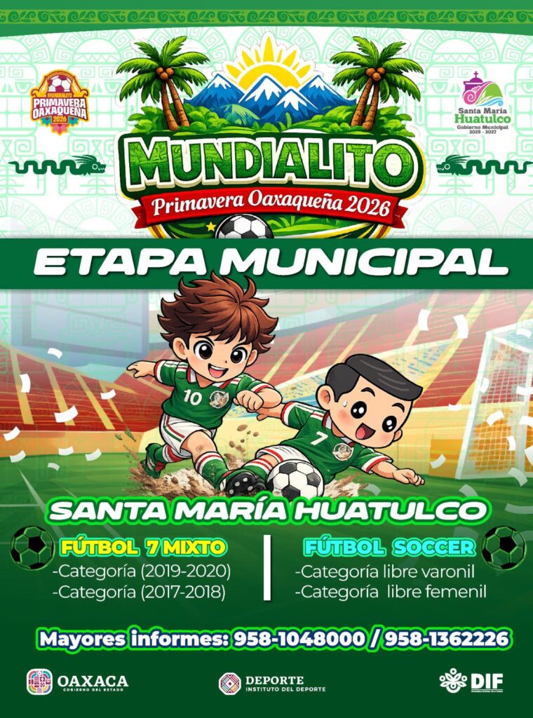 El Gobierno Municipal de Santa María Huatulco, a través de la Dirección de Deportes, convoca a niñas, niños, jóvenes y equipos a participar en la etapa municipal del Mundialito Primavera Oaxaqueña, iniciativa del Gobierno del Estado de Oaxaca mediante el Instituto del Deporte del Estado de Oaxaca.