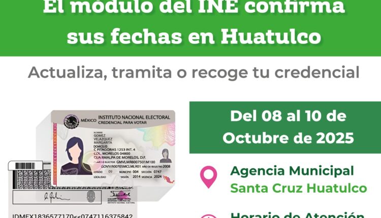 El Instituto Nacional Electoral (INE) informó que del 8 al 10 de octubre de 2025 se instalará un módulo de atención en la Agencia Municipal de Santa Cruz Huatulco, en un horario de 9:00 a.m. a 4:00 p.m.