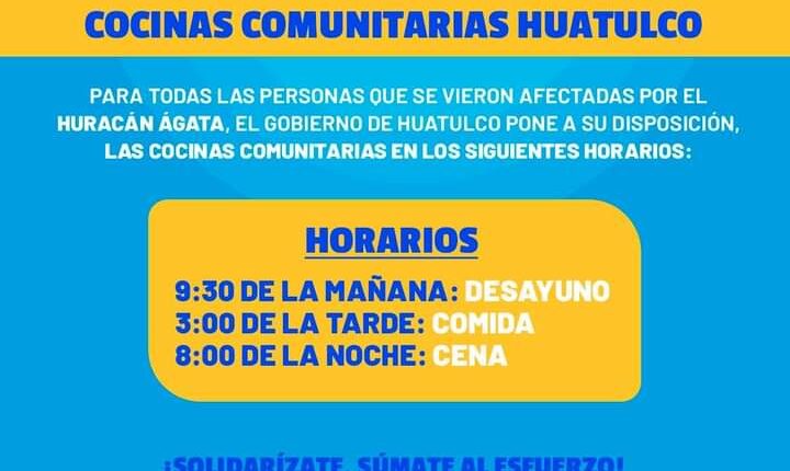 El Gobierno Municipal en coordinación con el Sistema DIF Huatulco, han habilitado las “Cocinas Comunitarias”, para ofrecer alimentos a todas las personas que resultaron afectadas por el Huracán Agatha, las cuales están ubicadas en las siguientes comunidades: