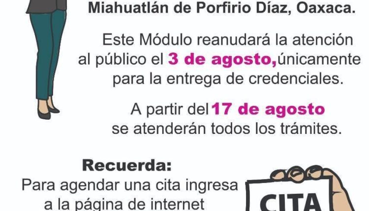 El Gobierno Municipal de Santa María #Huatulco en coordinación con el Instituto Nacional Electoral (INE) informa que el módulo de atención ubicado en Miahuatlán de Porfirio Díaz comenzará a brindar atención al público unicamente para entrega de credenciales a partir del 3 de agosto con cita previa.