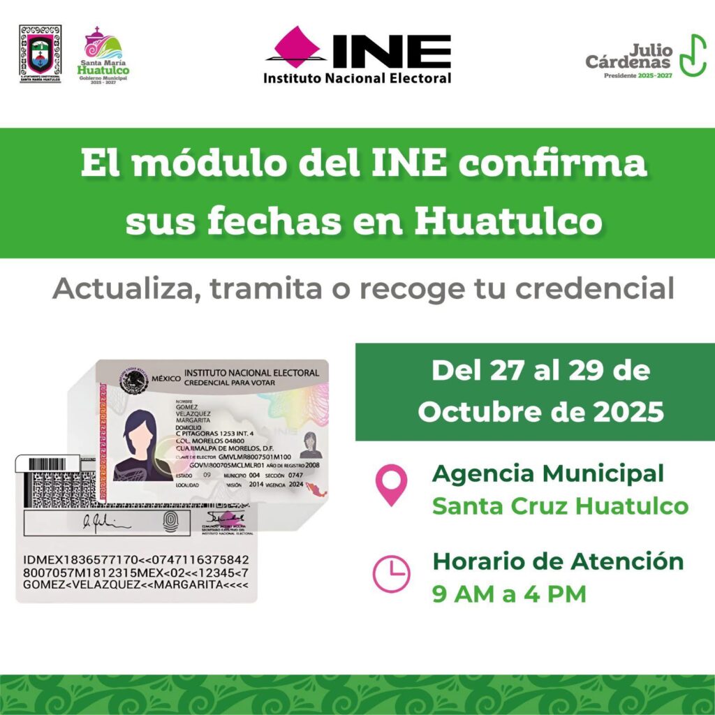 Del 27 al 29 de octubre de 2025, el Instituto Nacional Electoral (INE) estará atendiendo en la Agencia Municipal de Santa Cruz, en un horario de 09:00 a.m. a 04:00 p.m.