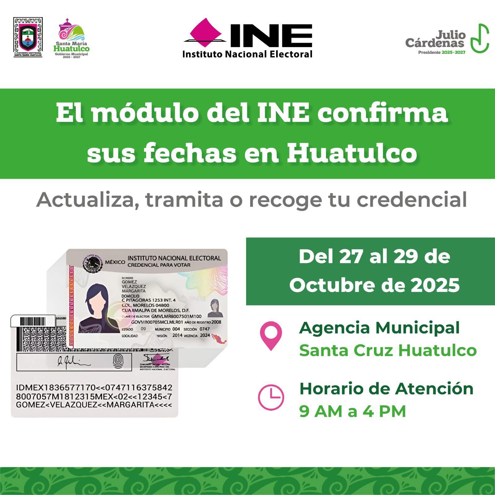 Del 27 al 29 de octubre de 2025, el Instituto Nacional Electoral (INE) estará atendiendo en la Agencia Municipal de Santa Cruz, en un horario de 09:00 a.m. a 04:00 p.m.
