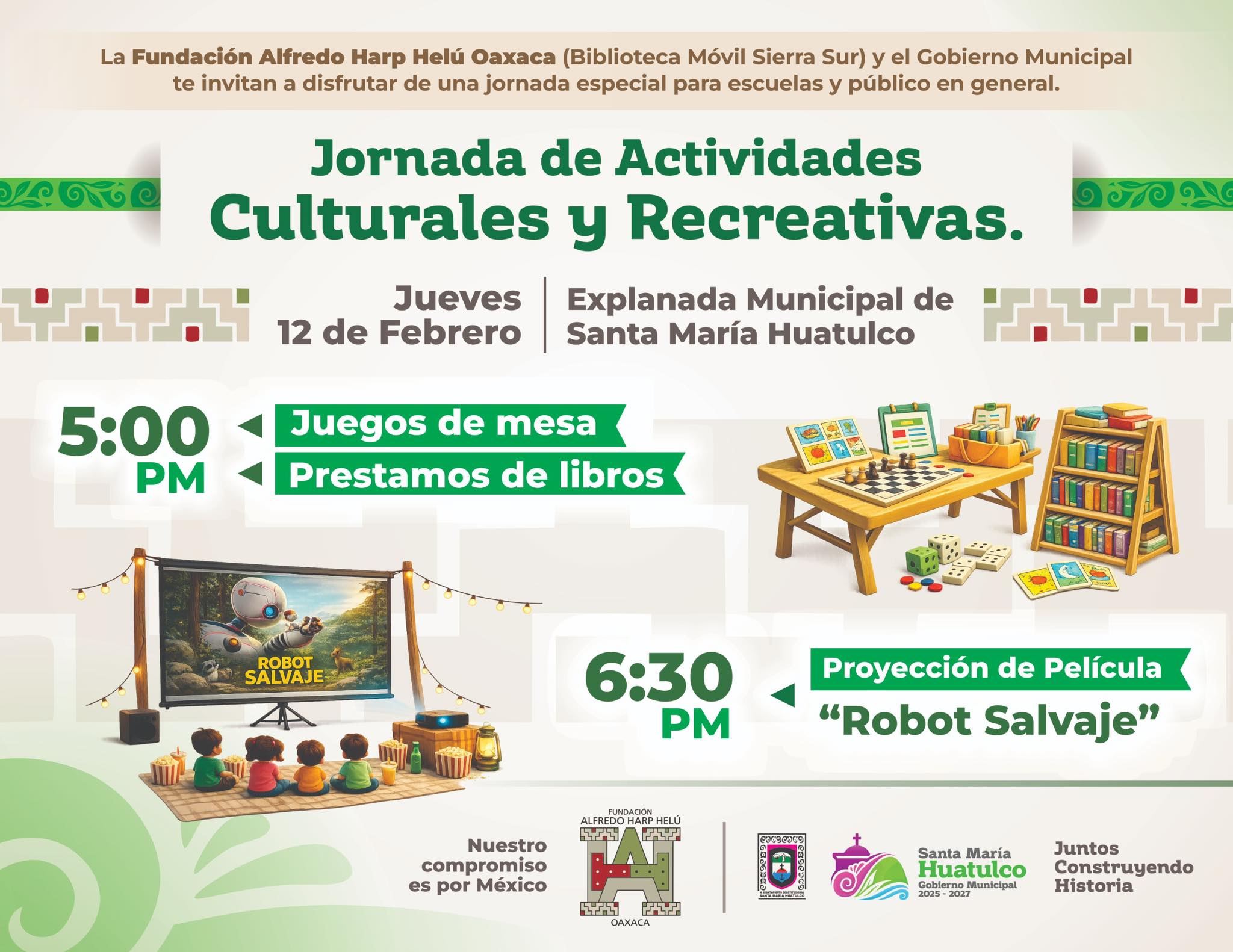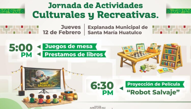Municipio Jornada de Actividades Culturales y Recreativas en Huatulco By Yvan Luna On Feb 12, 2026 7 Share Lugar: Explanada Municipal de Santa María HuatulcoFecha: Jueves 12 de febreroActividades: 5:00 p.m. Juegos de mesa y préstamo de libros 6:30 p.m. Proyección de la película “Robot Salvaje Ing. Julio Cárdenas OrtegaJulio Cárdenas HuatulcoNoticias en Huatulco 7 Share FacebookWhatsAppTwitterGoogle+PinterestEmail