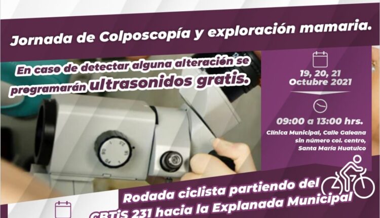 Municipio Jornada de colposcopía y exploración mamaria en Huatulco By Yvan Luna On Oct 18, 2021 19 Share El gobierno municipal invita a la ciudadanía a participar en la Jornada de colposcopía y exploración mamaria los días 19, 20 y 21 de octubre en la Clínica Municipal de Santa María Huatulco. El cambio lo hacemos todosGiovanne González GarcíaGiovanni GonzalezGobierno de HuatulcoGobierno MunicipalGobierno Municipal HuatulcoHuatulcoNoticias de la costa de Oaxaca 19 Share FacebookWhatsAppTwitterGoogle+PinterestEmail