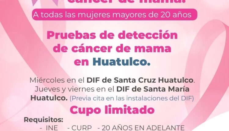 Asiste a nuestras instalaciones a partir de mañana a las 10 am y aprovecha la jornada de pruebas de detención de cáncer de mamá que el DIF Estatal ha programado a través del Sistema DIF Huatulco.