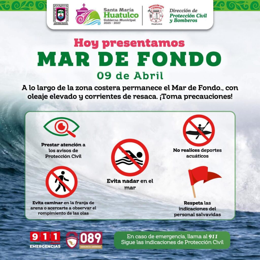 Durante este día continuará el fenómeno de mar de fondo en la zona costera de Huatulco, generando oleaje elevado y corrientes de retorno.