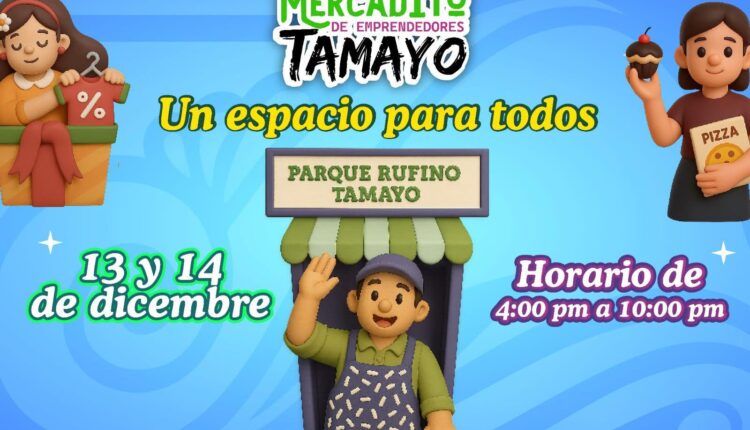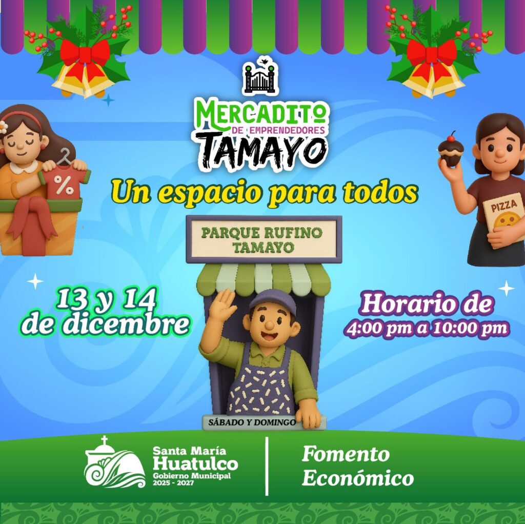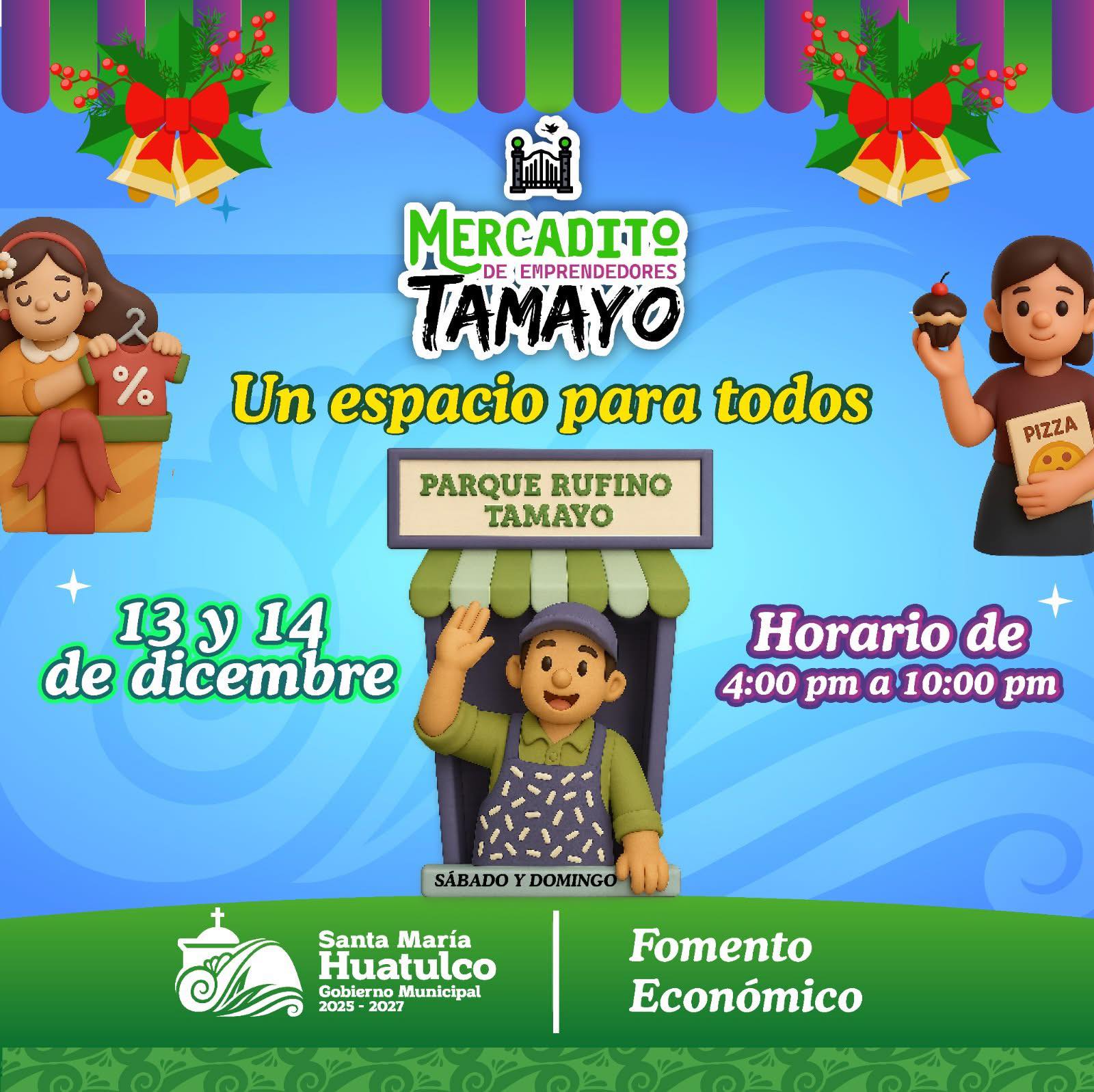 Municipio Mercadito de Emprendedores Tamayo By Yvan Luna On Dic 14, 2025 1 Share Te invitamos a disfrutar este 14 de diciembre del Mercadito de Emprendedores Tamayo, abierto hasta las 10 pm en el Parque Rufino Tamayo. Gobierno Municipal HuatulcoIng. Julio Cárdenas OrtegaJulio Cárdenas HuatulcoJulio Cárdenas presidente de HuatulcoJulio Cárdenas presidente Municipal HuatulcoNoticias en Huatulco 1 Share FacebookWhatsAppTwitterGoogle+PinterestEmail