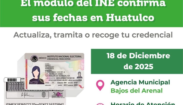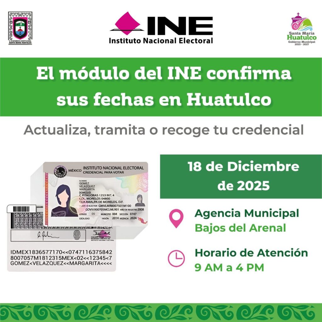 Municipio Módulo del INE en Bajos del Arenal By Yvan Luna On Dic 16, 2025 1 Share El módulo del INE estará el 18 de diciembre en Bajos del Arenal, Huatulco Gobierno Municipal HuatulcoIng. Julio Cárdenas OrtegaJulio Cárdenas HuatulcoJulio Cárdenas presidente de HuatulcoJulio Cárdenas presidente Municipal HuatulcoNoticias en Huatulco 1 Share FacebookWhatsAppTwitterGoogle+PinterestEmail