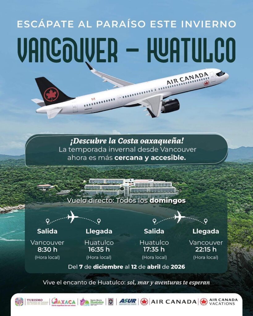 A partir de hoy, 7 de diciembre, comienza a operar el nuevo vuelo de Air Canada hacia Huatulco, una ruta que estará disponible hasta el 12 de abril de 2026. Con frecuencias todos los domingos desde el 12 de diciembre, esta conexión fortalecerá la llegada de visitantes y abrirá nuevas oportunidades para disfrutar del encanto natural, la hospitalidad y la belleza que distinguen a Huatulco como uno de los destinos más especiales de México.