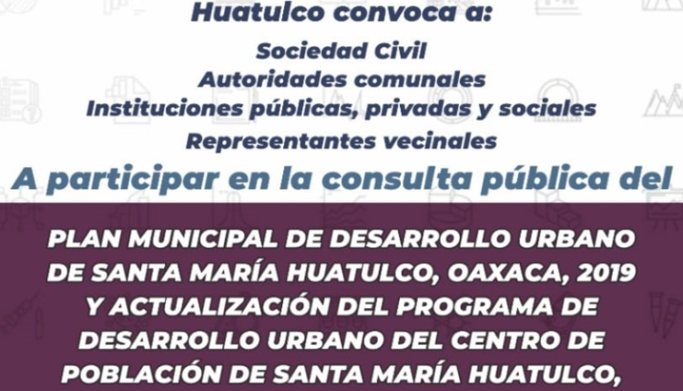 El gobierno municipal convoca a la ciudadanía en general a participar en la consulta pública del Plan de Desarrollo Urbano de Santa María Huatulco.