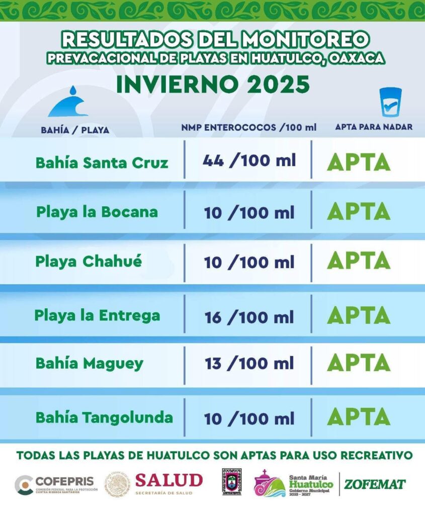 Todas las playas evaluadas son aptas para uso recreativo. Las bahías de Santa Cruz, La Bocana, Chahué, La Entrega, Maguey y Tangolunda cumplen con los estándares de calidad del agua, garantizando espacios seguros para habitantes y visitantes