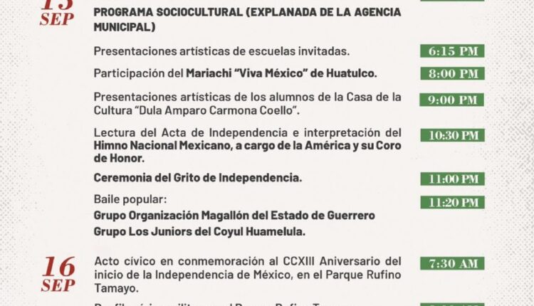 Este año, estamos emocionados de presentar un emocionante programa de actividades que hará que tu corazón lata al ritmo de México. Desde desfiles coloridos y conciertos musicales hasta deliciosas muestras de gastronomía mexicana, las festividades prometen ser inolvidables. Únete a nosotros para gritar con orgullo: ¡Viva México! ¡Viva Huatulco!