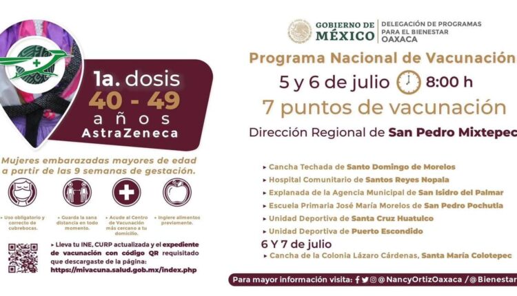 Te compartimos el programa de Vacunación, para personas de 40 – 49 años que se llevará a cabo este 5 y 6 de julio en la Unidad Deportiva de Santa Cruz Huatulco, a partir de las 9:00 am
