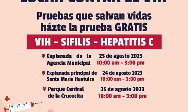 Municipio Pruebas gratuitas de VIH,Sífilis y Hepatitis C en Huatulco By Yvan Luna On Ago 22, 2023 11 Share Chécate, cuídate. Este 23 y 25 de agosto estará la unidad móvil del COESIDA_GobOax, harán pruebas gratuitas de:✅ VIH,✅ Sífilis✅ Hepatitis C 11 Share FacebookWhatsAppTwitterGoogle+PinterestEmail