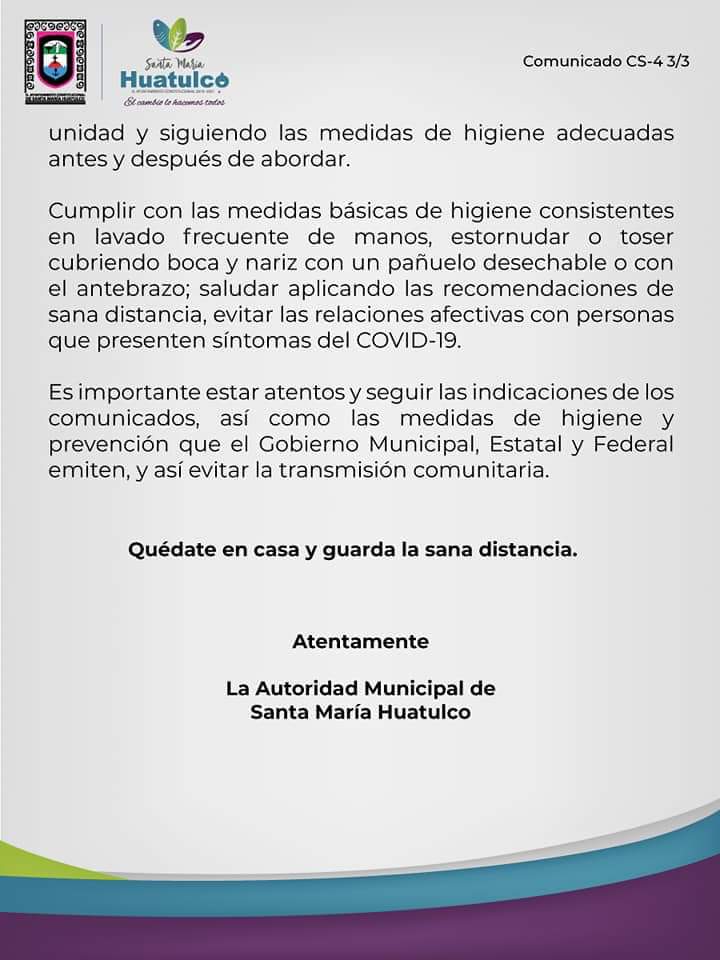 Comunicado Oficial del Gobierno Municipal de Santa María #Huatulco y medidas de prevención ante la fase II de la contingencia de Salud #COVID19